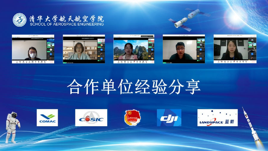 在合作单位分享环节中,中国商飞上海飞机设计研究院教育培训中心陆海平主任介绍了“产品驱动、产教融合、产业育人”的方略,激励广大青年人才投身航空事业;中国航天科工集团第四研究院第四总体设计部高雪莲处长介绍通过“航天四部开拓杯”未来飞行器设计大赛的交流平台,四院四部加强了与高校的沟通协作;共青团黄冈市委洪英副书记详细介绍了黄冈市校合作和人才引进政策,热切期待广大清华学子的到来;大疆创新科技有限公司卓宇迎经理展示了“RoboMaster”协同育人的创新型项目在与国内外高校合作过程中丰硕的育人成果;蓝箭航天空间科技股份有限公司闫新建总经理从公司的雄厚实力和产学研战略人才培养等方面展示了学生实习实践的优势。五家单位代表分别从自身单位的优势、校企合作、人才培养等方面进行介绍,为同学们实践就业提供新思路,为其他参会单位人才培养探索新模式,为校企合作拓展新渠道。