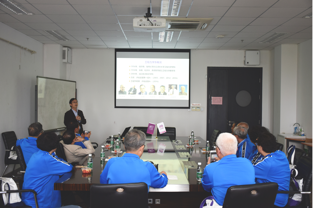 的历史沿革并向各位老学长介绍了学院近期的发展情况。陈老师介绍到,工程力学系发展到现在已经拥有了实力雄厚的师资力量以及有很强竞争力的科研实力。郑泉水院士团队的结构超滑研究、过增元院士团队的热学新理论研究、冯西桥教授团队的生物组织及软质材料力学研究等,在陈老师的讲解下生动而形象地展现在各位校友眼前。陈老师说,人才培养是清华工程力学系的最大优势,各位学长各位校友是我们的最大财富。目前,我院培养出的众多青年校友正在高校、重点企业、基层等充分贡献着自己的力量。