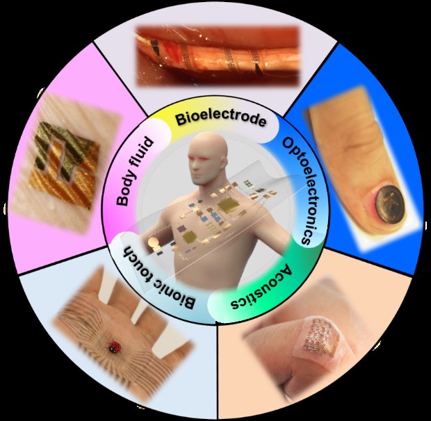 图3. 用于生理参数监测的柔性混合电子:柔性生理电器件、柔性光电器件、柔性声学器件、柔性类皮肤功能器件和柔性生化检测器件