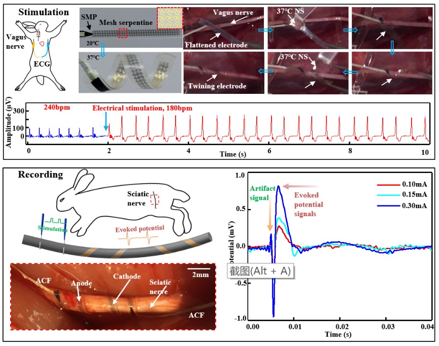 图4. 基于柔性混合电子技术的自攀爬三维螺旋电刺激器件