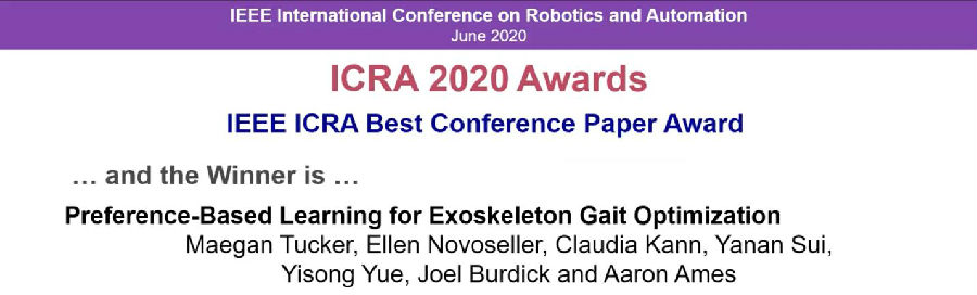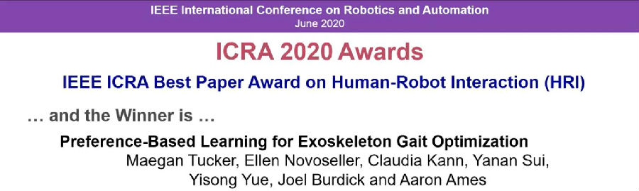 院助理教授眭亚楠与美国加州理工学院的合作者发表了题为“基于偏好反馈的外骨骼步态优化学习”(Preference-Based Learning for Exoskeleton Gait Optimization)的研究论文,获得大会唯一最佳论文奖,并同时获得最佳人机交互论文奖。