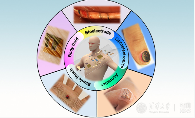 图为 用于生理参数监测的柔性混合电子:柔性生理电器件、柔性光电器件、柔性声学器件、柔性类皮肤功能器件和柔性生化检测器件