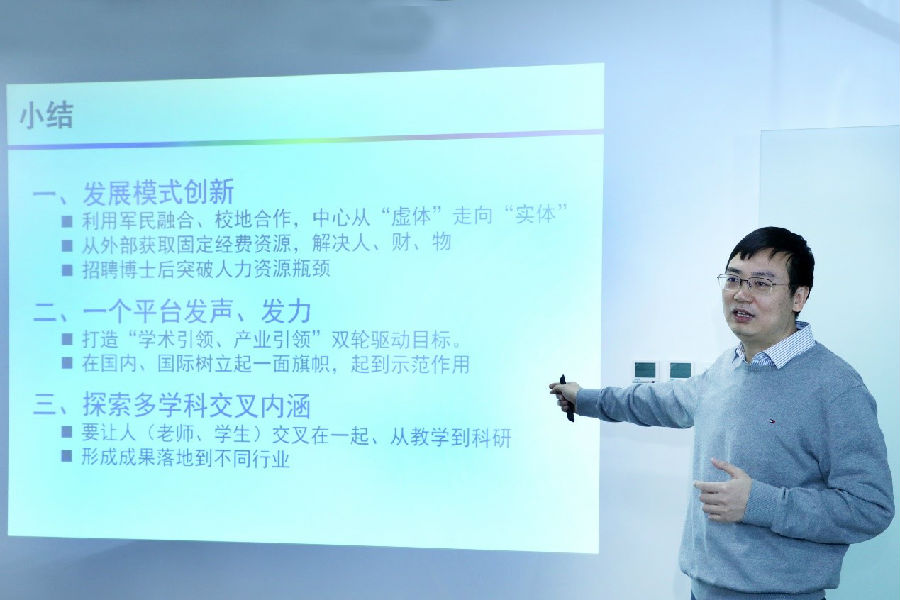 图为柔性电子中心主任冯雪汇报中心工作情况、规划及计划