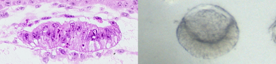 图为 后着床期人类胚胎的核心结构—羊膜囊(左)与基于干细胞构建的羊膜囊类胚胎(右)