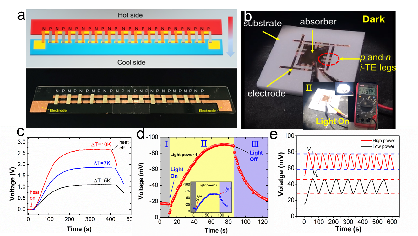 此外,研究人员开发了基于离子热电效应的无接触式自供电热智能探测器,在较宽的光、热刺激范围内展现出优异的响应特性、可重复性和高灵敏度。同时,研究人员开发出由13对P-N热电臂组成的平面式热传感器,该传感器在10K温差下可产生2.5V稳定电压。
