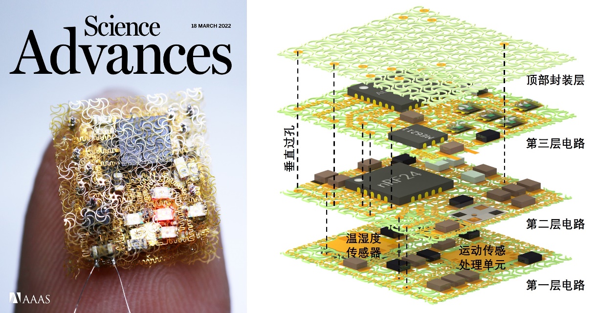 文章于3月16日在《科学·进展》(Science Advances)期刊以“基于层叠网格的高集成度小型化可拉伸电子器件”(Highly-integrated, miniaturized, stretchable electronic systems based on stacked multilayer network materials)为题发表,并被选为当期封面(图3)。