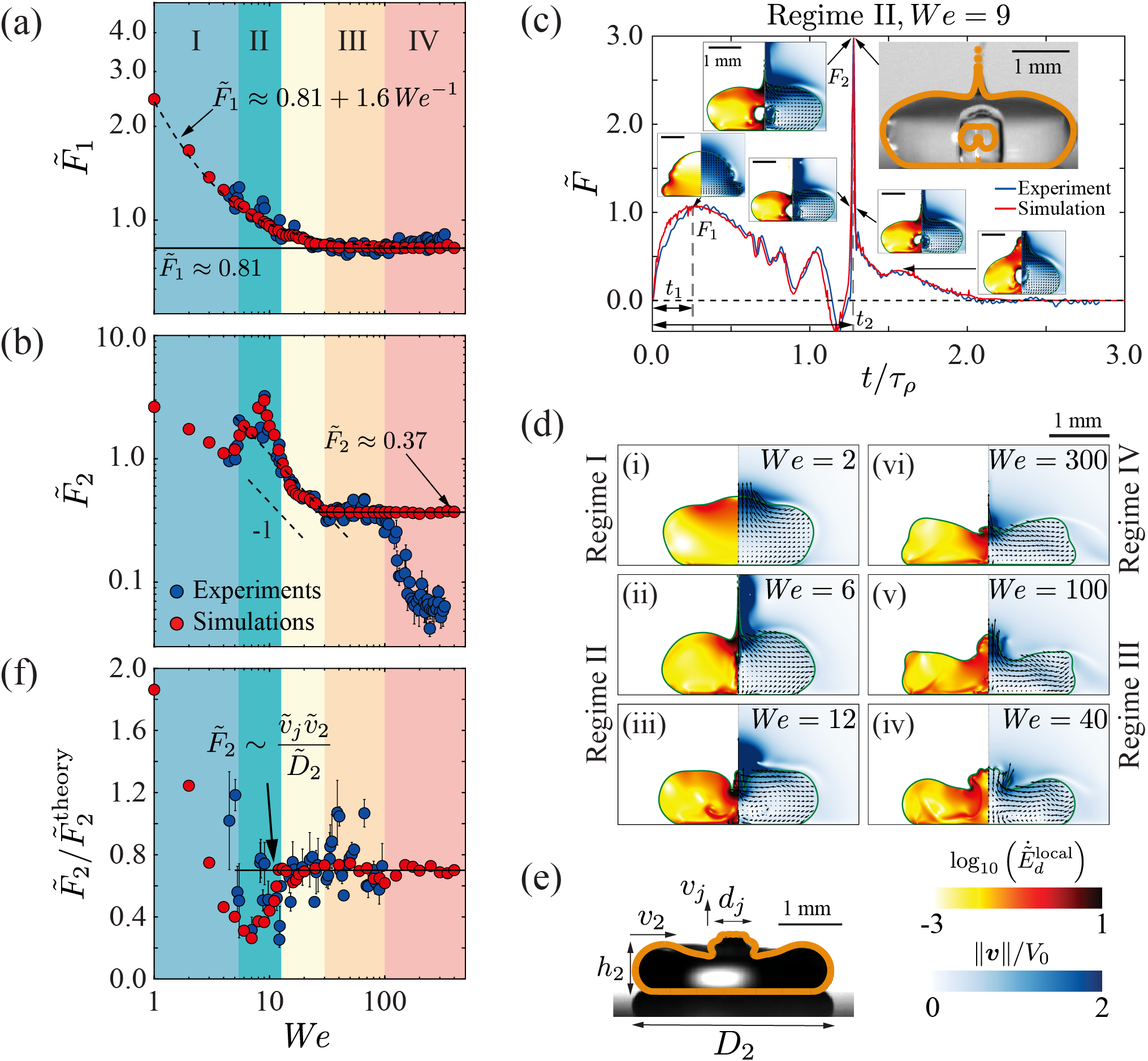 图2.水滴撞击力峰值随韦伯数的变化规律;(a)第一个峰值力随韦伯数的变化规律;(b)第二个峰值力随韦伯数的变化规律;(c)气穴溃灭引起的高速射流及作用力;(d)不同韦伯数下撞击力达到第二个峰值时对应的水滴形态;(e)参数定义;(f)第二个峰值力的理论预测、数值模拟与实验结果对比