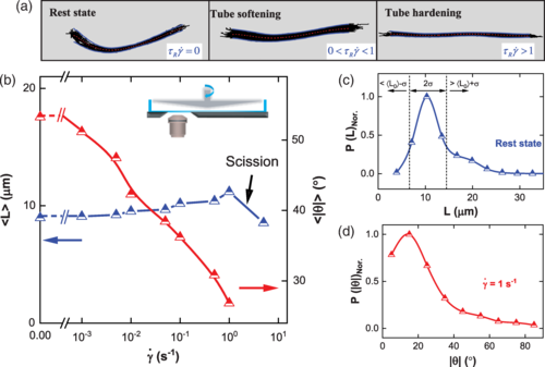 院曹炳阳教授和美国科学院院士、韩国基础科学院软物质及生命材料基础科学研究所史蒂夫·格拉尼克(Steve Granick)教授课题组合作在期刊《物理评论快报》(Physical Review Letters)上发表了题为“生物聚合物链缠结在剪切流场中先软化后硬化”(Biopolymer filament entanglement softens then hardens with shear)的论文。通过单分子荧光成像技术,直接观测到了单分子肌动蛋白在剪切流场中的定向排列与拉伸行为。随剪切速率的增加,聚合物分子链的管道先在定向排列的作用下“软化”,再在拉伸的作用下“硬化”。这表明聚合物的动态局域行为受到单分子链的定向排列与拉伸的共同影响。