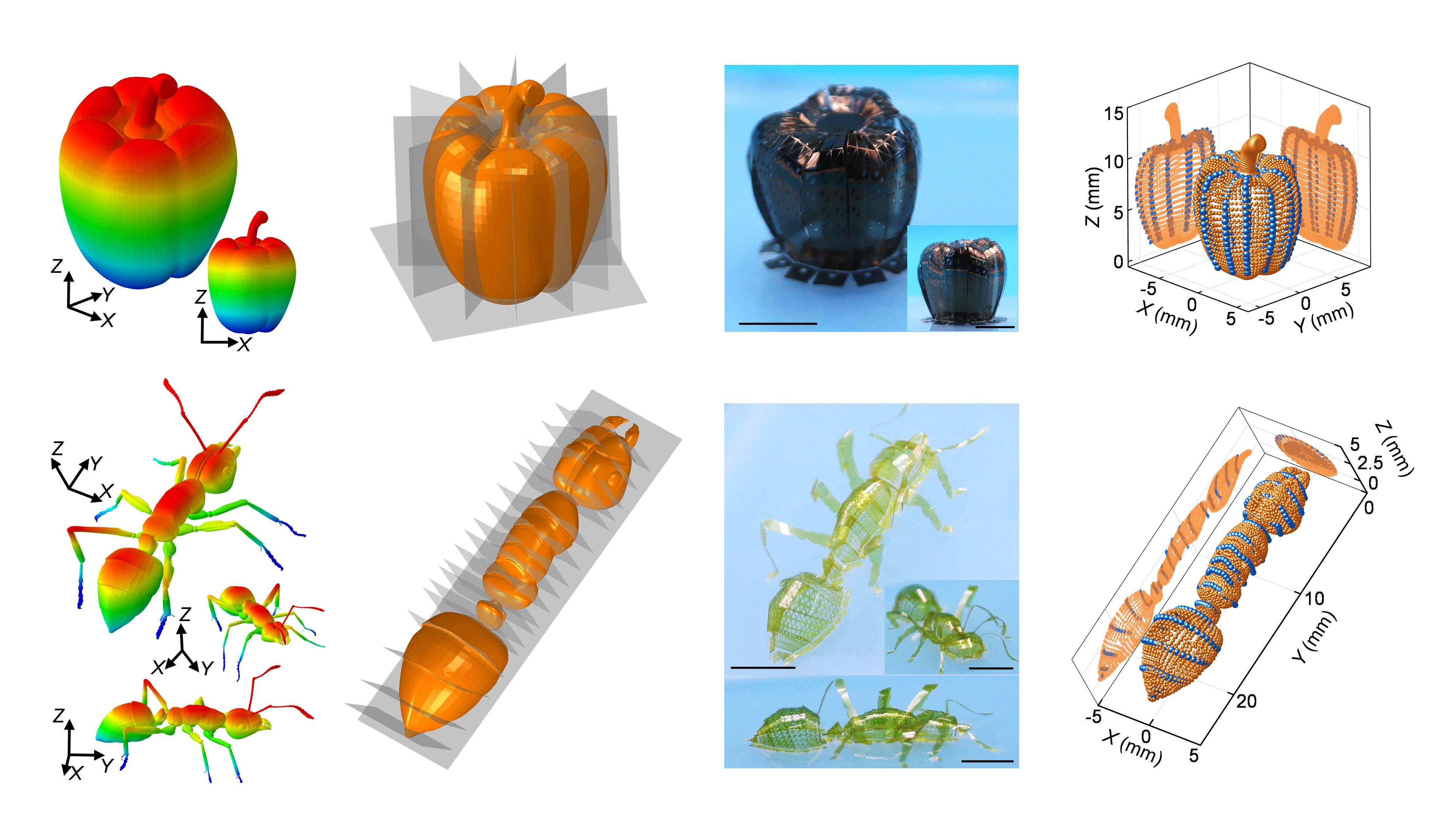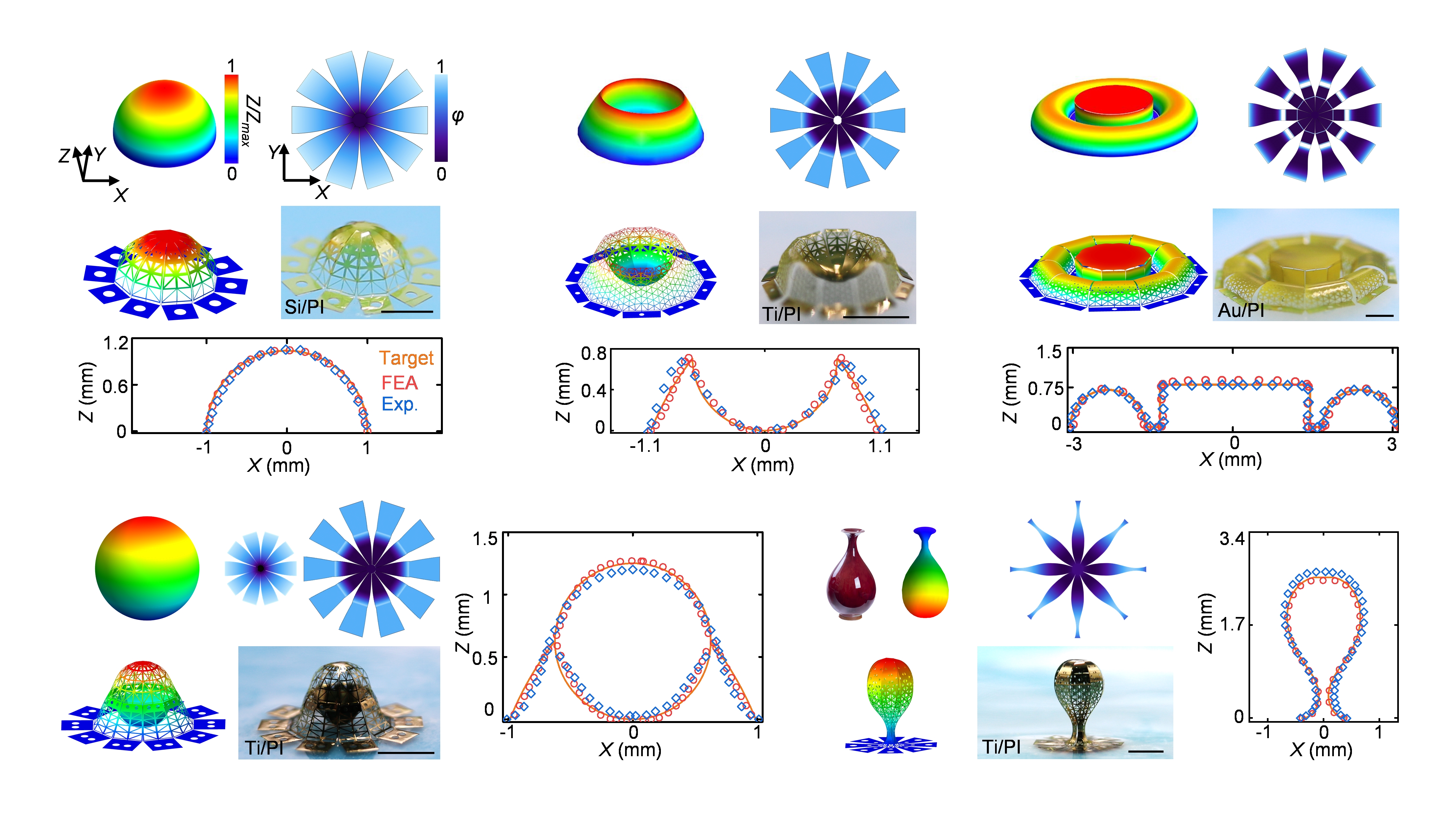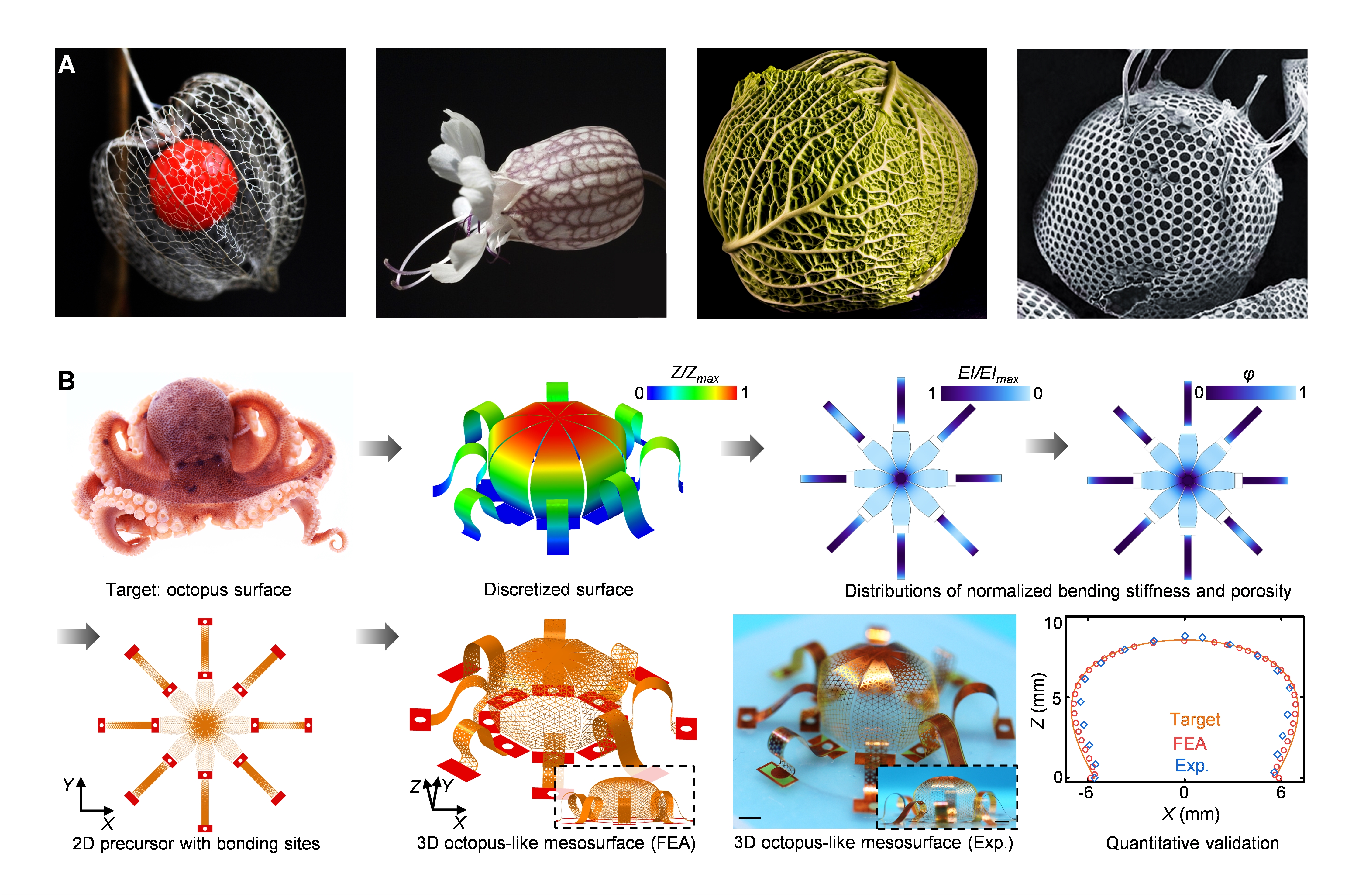 三维多孔微结构在生物体中广泛存在,它们在生物曲面的成型、营养物质的合成与输运、植物生长等方面发挥着多样的、不可替代的作用。由于多孔结构具有轻质高强、高比表面积、优异热学性能等优势,仿生多孔设计在新型材料和器件系统的研制中已得到广泛应用,包括高比刚度/比强度的点阵/泡沫材料,人造组织/器官中的分层血管网络和电磁超材料等。然而,利用仿生多孔微结构来调控三维曲面几何形状方面的研究仍为空白。从应用需求出发,制造具有可定制几何形状的微尺度三维曲面结构及器件,在生物电子学、微型机器人、微纳光学等领域有着重要的应用价值。