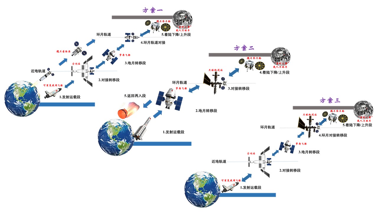 图1是2030年载人登月的运输系统方案,在这个方案中,所有飞行器都是一次性使用的。图2给出了三种航班化运动大系统构成方案,分别是利用现有空间站、经由月球轨道站中转、和同时经由空间站和月球轨道站中转。第二和三种方案和月面长期驻留的任务目标相契合,第三种方案也最具经济性,但都需要以月面可以提供飞行器燃料为前提条件。