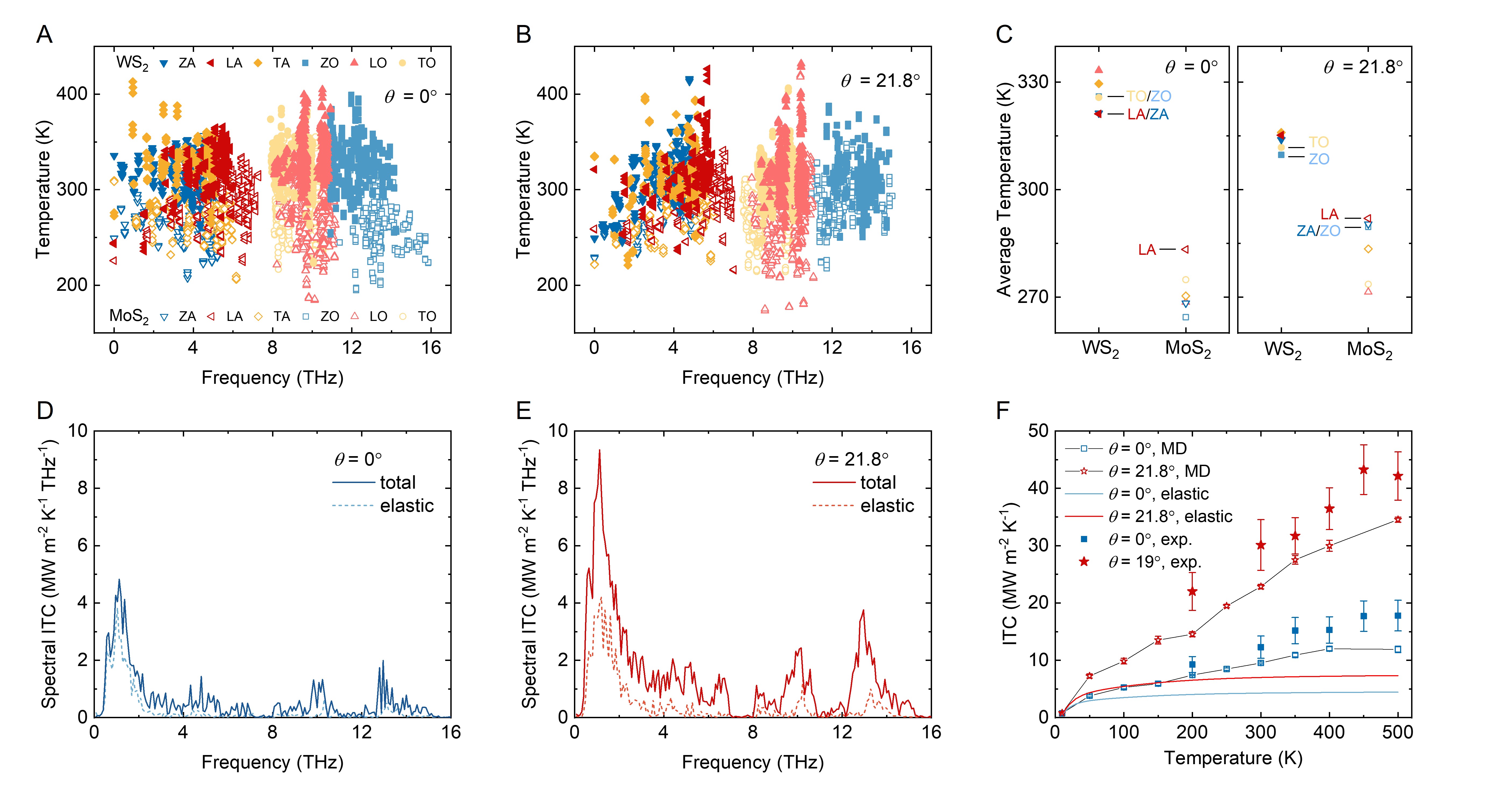 进一步的模态温度分解与频谱热流分析揭示,在MoS2/WS2异质界面中,热输运本质上由非弹性声子散射主导。扭转角的引入重构了界面处的非平衡声子温度分布,使高频光学声子能够通过频率下转换有效激发对侧的声学声子,从而打开更多跨界面传热通道。研究表明,在未扭转界面中,非弹性散射已占总热导的55%;而在21.8°转角下,其贡献提高至70%,且非弹性部分的提升幅度远高于弹性部分。这一发现揭示了界面导热异常增强的内在机理,并进一步统一了扭转对同质与异质界面导热行为的调控规律:扭转均会增强界面非弹性声子散射,但在同质界面中热输运以弹性散射为主,非弹性增强反而引入额外热阻;而在异质界面中原本即由非弹性散射主导,扭转进一步放大该机制,从而导致了界面热导的提升。