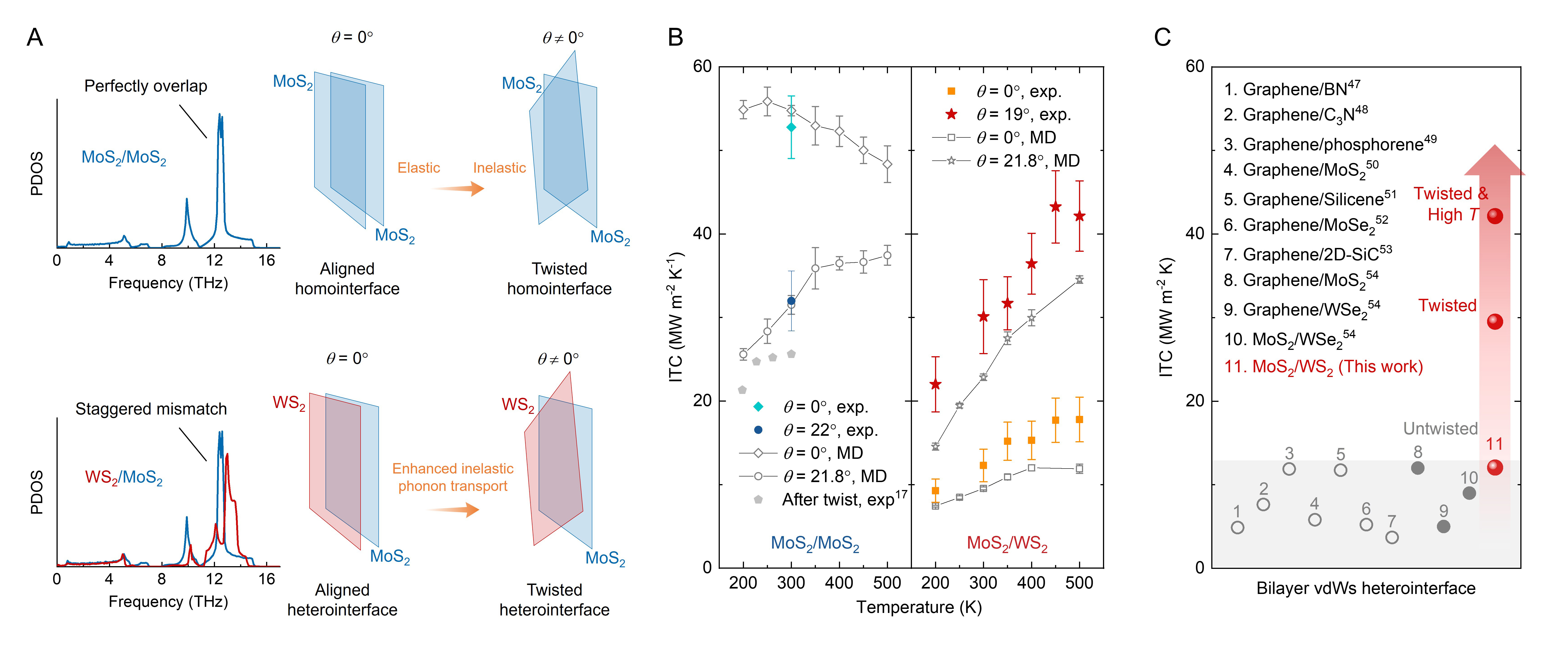 院张兴教授、马维刚教授团队在二维范德华异质结界面热输运研究领域取得重要突破。在后摩尔时代的电子器件中,范德华异质结因其可设计的能带结构和优异电学特性而成为新型集成电路的重要候选。然而,不同材料之间的声子失配导致界面热导普遍较低(通常约10MW m-2K-1量级),严重制约器件的散热性能和可靠性。长期以来,国内外研究人员普遍认为,在同质结构中引入层间转角会破坏晶格的对称性,增强无序散射,从而降低界面热导。基于这一共识,“扭转”通常被视为抑制热输运的因素。